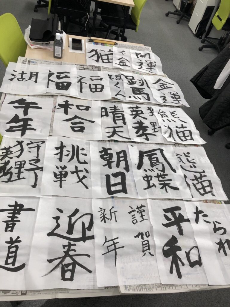 次に書初めをすることになり、皆さん思い思いに自分が書きたいと思った言葉を書いておられました。「朝日」や「迎春」などお正月を感じさせる言葉が並び、お正月気分をひしひしと感じました。この写真を見ても皆さんの個性が表れていてとてもいい作品ばかりだと思います。書初めは小学校以来だったのでとても新鮮な気持ちになりました。